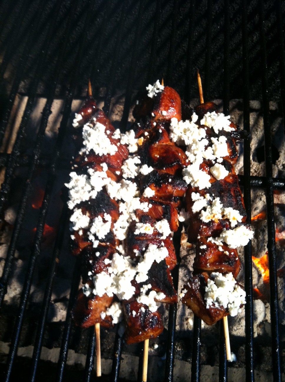 30 minutes before cooking time (or while the charcoal is heating up) pour one cup of the raspberry vinaigrette in a small sauce pan. Bring to a slow boil to reduce it and allow to thicken up. Take the meat out of refrigerator and skewer. I kept the meat together and put veggies on other skewers. I didn’t want the blue cheese and sauce on the veggies. You might like it that way. I see no reason you could not mix it all up.