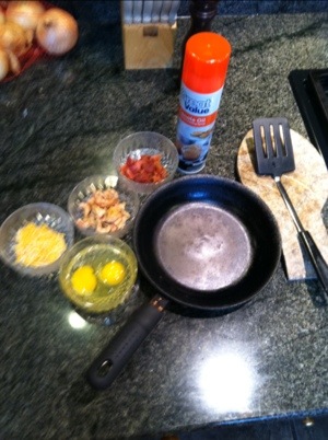 Put two eggs in a mixing cup, add a tablespoon of water and a dash of seasoning. Coat a 6 inch non-stick frying pan with the canola oil spray. Heat the pan to med-high. While the pan is heating stir the egg mixture well with a fork. You can use an electric mixture also, but I find that to be one extra thing to clean. Mixing well creates bubbles and water creates steam bubbles, both help fluff up the omelet during the cooking process. When the pan is hot, pour in the egg mixture. When the bottom half starts to firm up add the bacon and cut the heat back to medium-low. Add the crawfish and cheese to a half side of the omelet when the mixture begins firming up around the bacon.